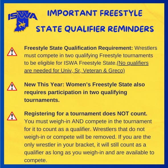 Wrestlers must wrestle at ISWA Freestyle and/or Greco State in orderto wrestle at Central Regionals on May 15–17, 2026, in Louisville, KY.